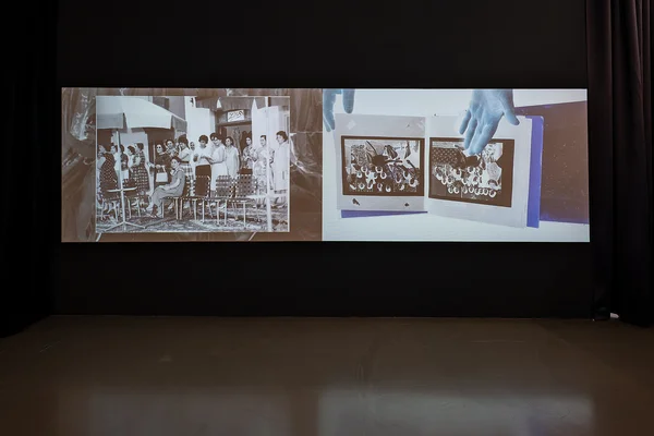 In ihrer Videoinstallation On Another Note (2024) greift Huda Takriti auf das künstlerische Erbe ihrer Großmutter Hikmat Al-Habbal zurück, die in den 1960er-Jahren als Lehrerin und Textilkünstlerin in Kuwait lebte. So veranschaulicht sie, wie Geschichten über Generationen hinweg weitergegeben werden und sich weiterentwickeln. Im Mittelpunkt der Arbeit stehen die Hände von Takritis Mutter, die Fotos durchblättert und Textilarbeiten entfaltet – einige davon waren von der Großmutter bewusst unvollendet gelassen worden, damit die nachfolgenden Generationen sie nach ihrem Tod weiterführen konnten. Takriti nutzt diese Fotos und Textilien als Ausgangspunkt, um eine neue „potenzielle Geschichte“ zu erzählen – mit diesem Begriff beschreibt die Kulturtheoretikerin und Kuratorin Ariella Aïsha Azoulay die Offenheit der Geschichte. Eine Geschichte, die sich der imperialistischen Überzeugung widersetzt, dass vergangene Ereignisse keinen Anfang und kein Ende haben, sondern bis in die Gegenwart fortbestehen.